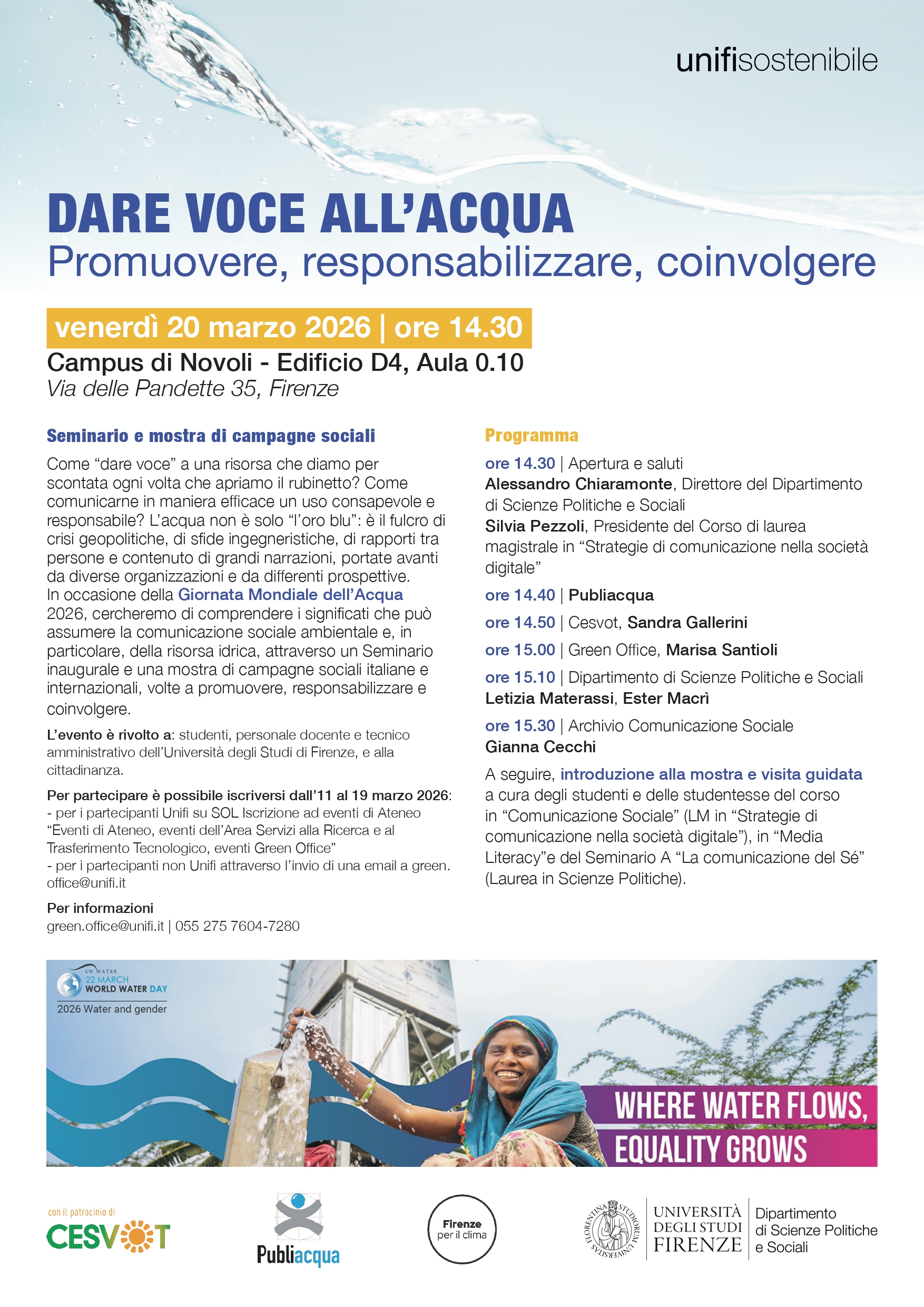 In occasione della Giornata Mondiale dell'Acqua 2026, l'Ateneo organizza il seminario "Dare voce all'acqua", seguito dall'inaugurazione di una mostra di campagne di comunicazione italiane e internazionali sul tema delle risorse idriche.